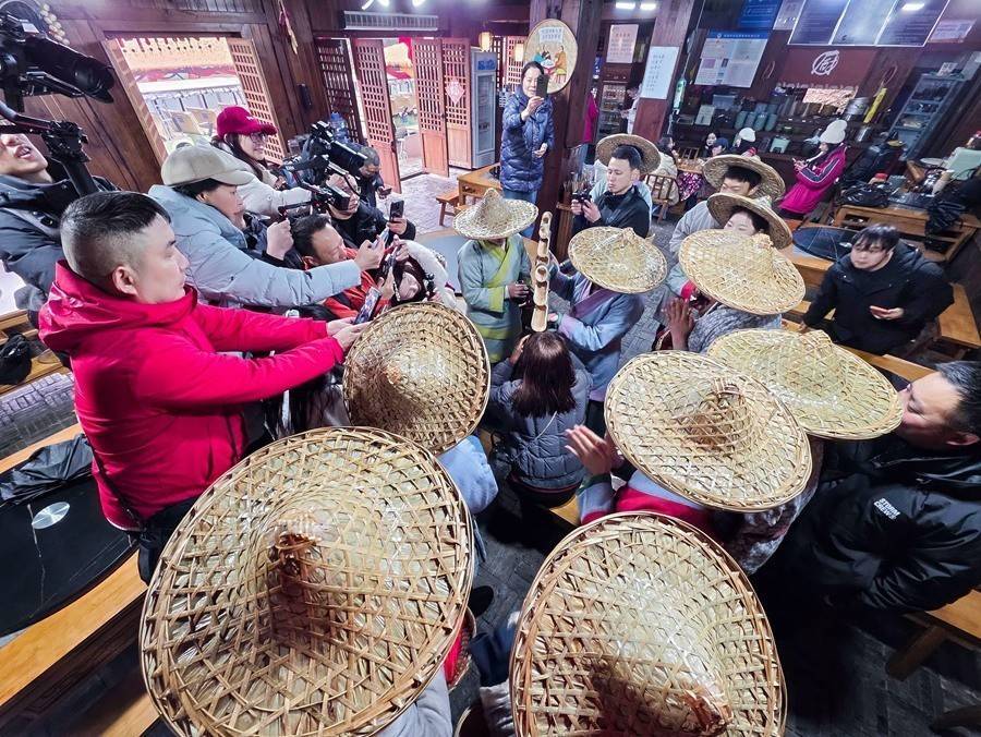 穿过狭窄的洞口,眼前豁然开朗——这便是秦谷。2026年的春节,这里不再是冰冷的景点,而是充满烟火气的“秦人村落”。家家户户门前挂着腊肉,空气中弥漫着糯米蒸熟的甜香。在寰楼前,一场热闹的婚嫁巡游正在进行,新郎需经过射雁、对诗等重重考验才能迎娶新娘,这正是源自周代“六礼”的非遗传承。